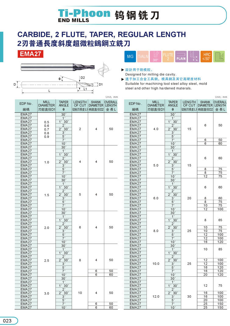 15. 2刃超微粒鎢鋼斜度立銑刀024